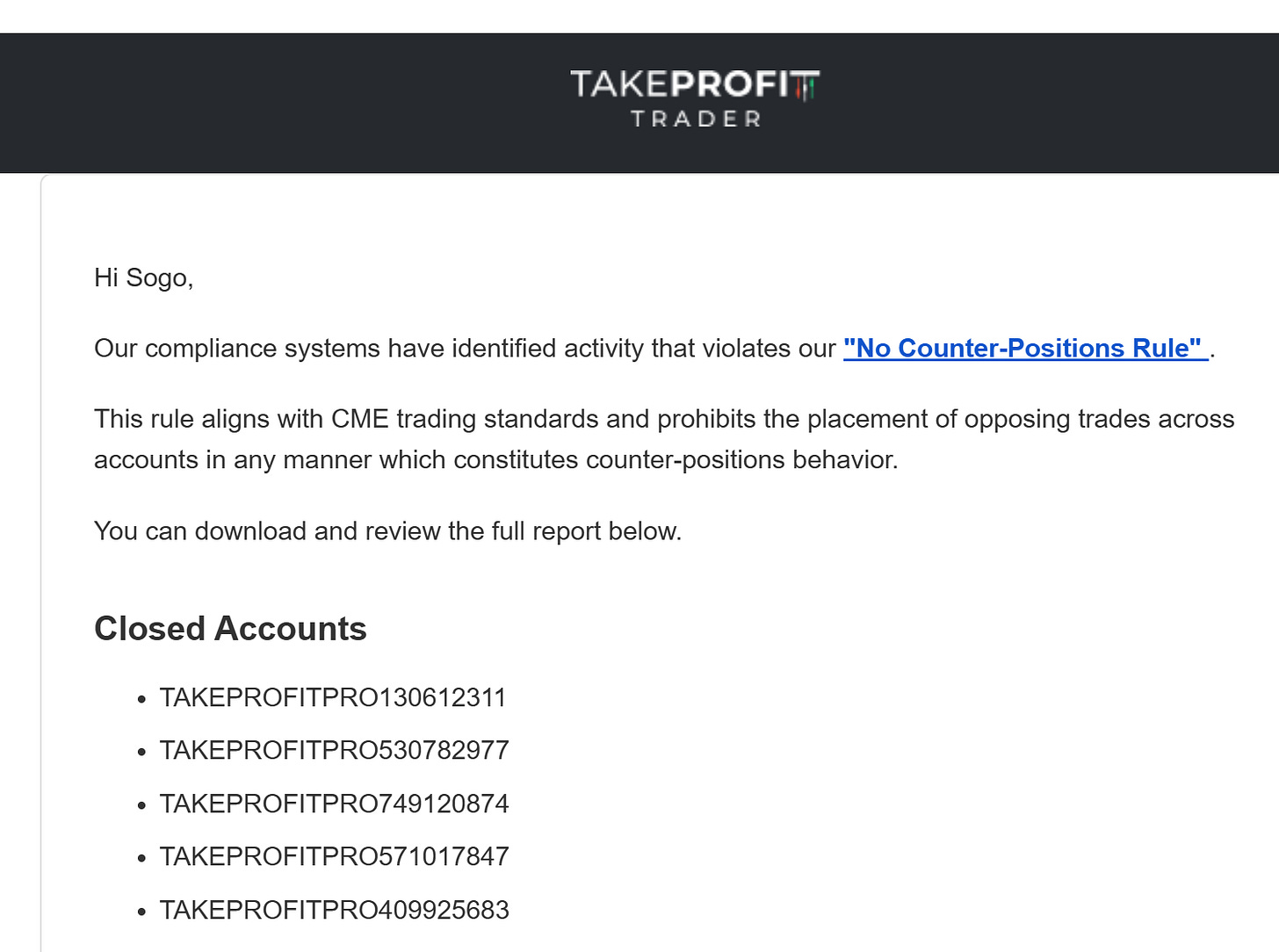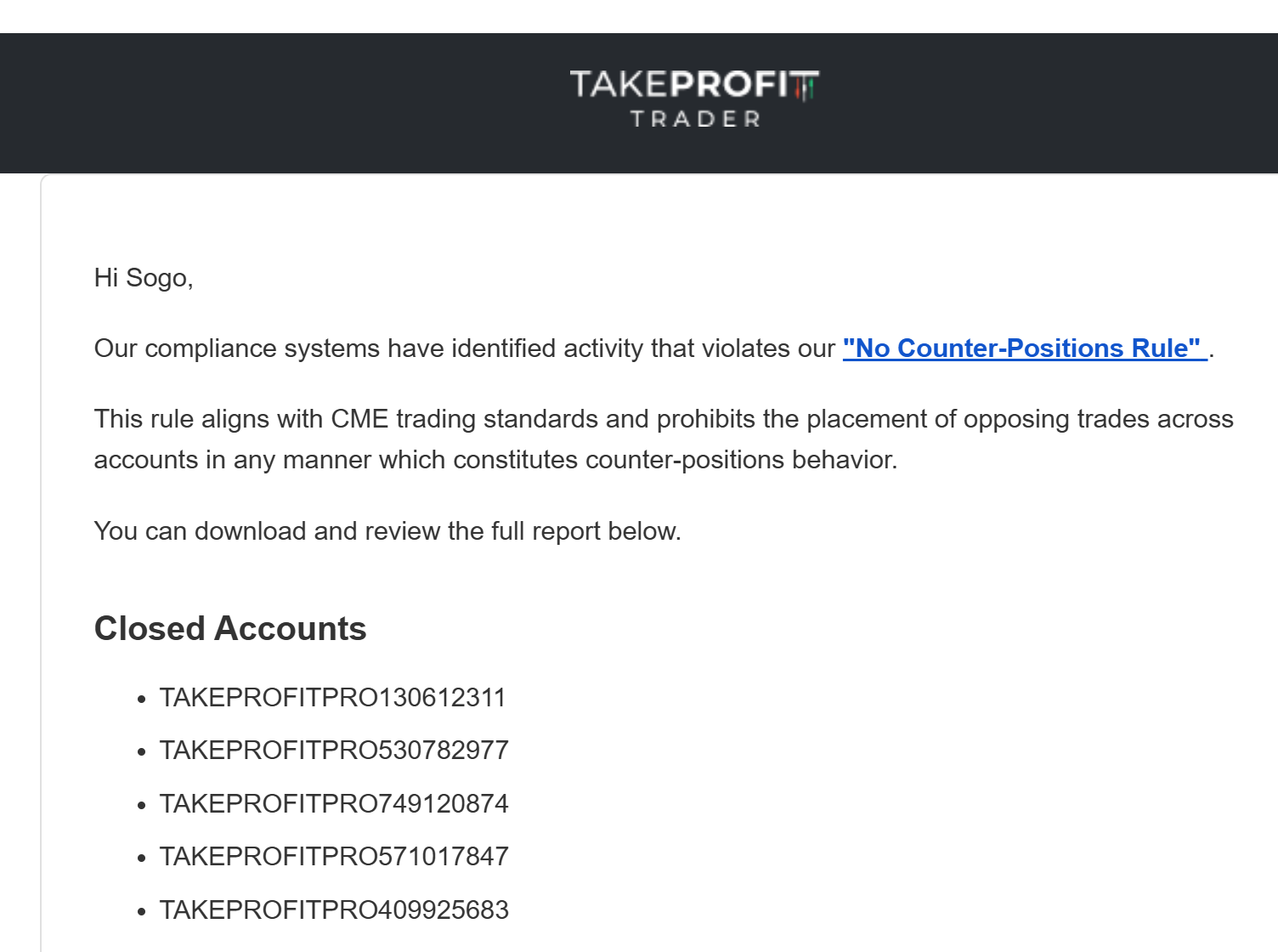 Thursday morning, an email from TakeProfitTrader. All five accounts canceled. A No Counter-Position Rule violation, they said, likely triggered by the copier -- a technical rule, buried somewhere, with no dashboard to monitor it and no warning before the breach.