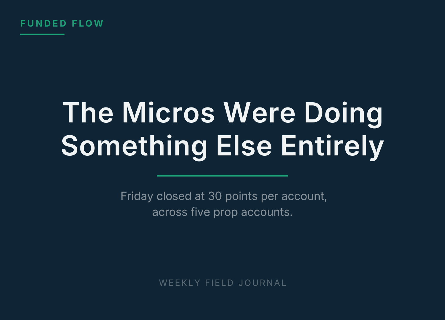 Friday closed at 30 points per account, across five prop accounts, with one Mini contract on each.